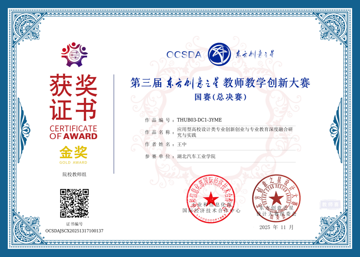 本网讯(文 沈小清/图 王中)近日,2025年第三届东方创意之星教师教学创新大赛全国总决赛在江苏大学圆满落幕。我校设计学院王中老师凭借卓越的教学创新实力与专业素养,在本届大赛中表现优异,其《应用型高校设计...