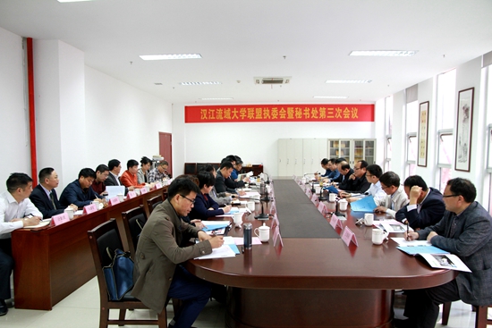 本网讯(文 董圣滨/图 杜剑彬)4月3日上午,汉江流域大学联盟执委会暨秘书处第三次会议在我校召开。南阳理工学院党委书记邢勇、湖北医药学院校长李和、汉江师范学院校长杨鲜兰、安康学院副校长张东红、湖北工程学院副校长鲁旭东、湖北文理学院副校长刘伦钊、南阳师范学院党委副书记邵书峰、商洛学院副校长刘勇、陕西理工大学副校长冯小明等来自汉江流域包括鄂陕豫三省的11所联盟高校执委会委员出席会议,联盟高校秘书处成员以及相关部门负责人参加了会议。