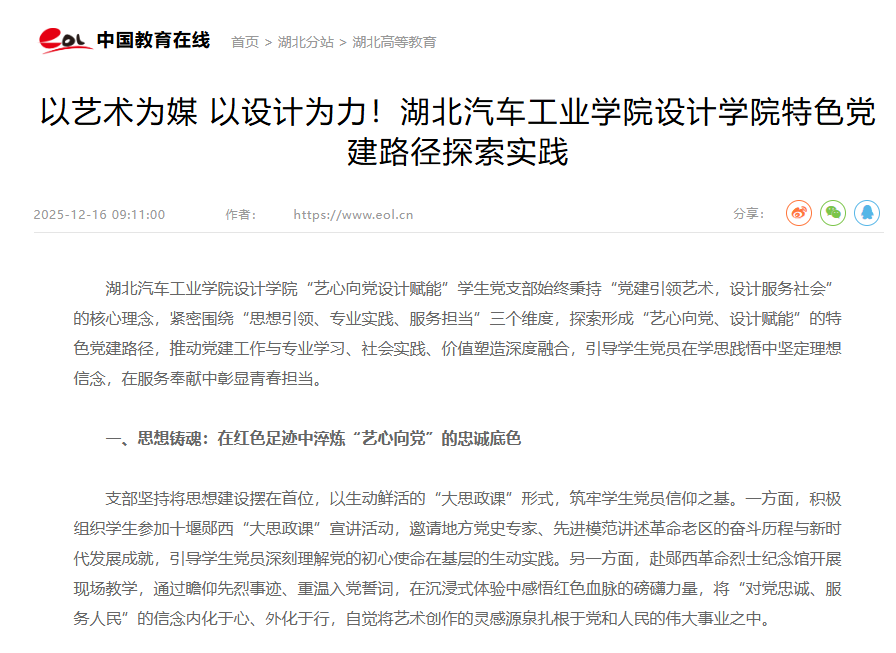 【中国教育在线】以艺术为媒 以设计为力!湖北汽车工业学院设计学院特色党建路径探索实践