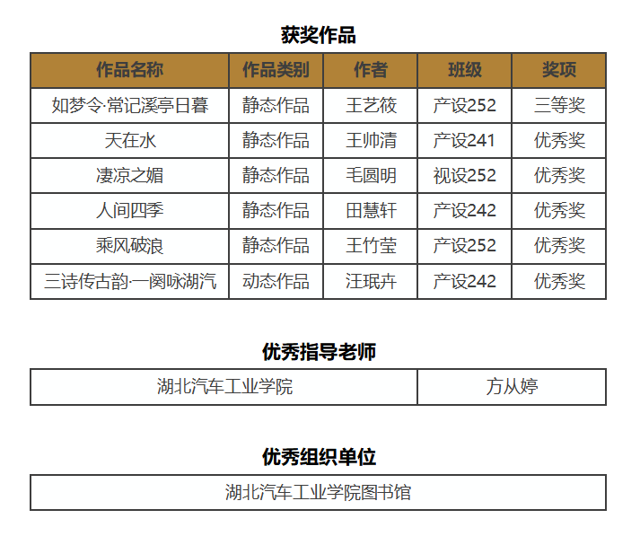 为深入推进美育教育工作,落实立德树人根本任务,设计学院积极组织学子参与首届湖北省“书香浸润”中华诗词美育作品创作大赛。最终斩获8项省级荣誉。