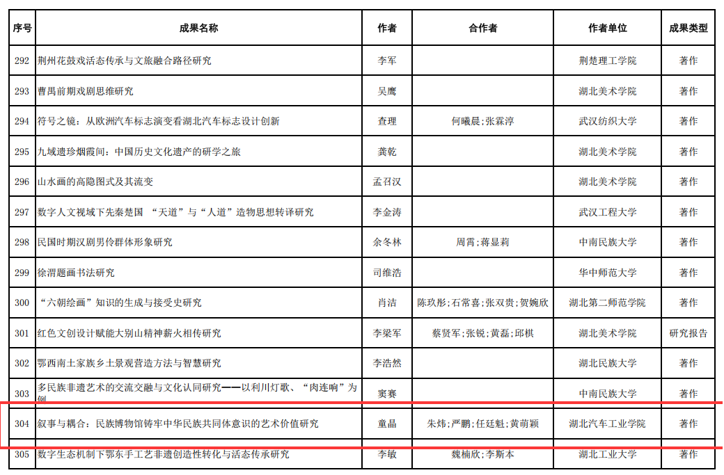 本网讯(文/图 何沛然)近日,湖北省社会科学界联合会公布了2025年度湖北省社科基金后期资助项目立项名单。我校设计学院童晶博士主持申报的《叙事与耦合:民族博物馆铸牢中华民族共同体意识的艺术价值研究》课题成功获批立项。这是童晶博士第二次获得省社科基金项目,也是设计学院自2023年以来,连续第三年获得该类项目资助。