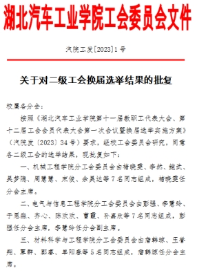 根据《湖北汽车工业学院第十一届教职工代表大会、第十二届工会会员代表大会第一次会议暨换届选举实施方案》,我单位于2023年11月6日召开了教职工(代表)大会、工会会员(代表)大会。大会应到36人,实到31人。大会以无记名投票方式选举产生了学院工会委员会委员。学院工会委员会于6日召开了全体会议,选举产生了艺术与设计学院工会主席。现将选举结果报告如下: